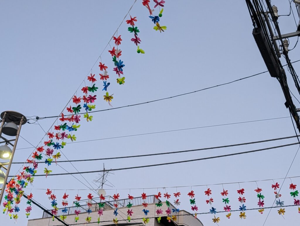 Decorative streamers above a street.