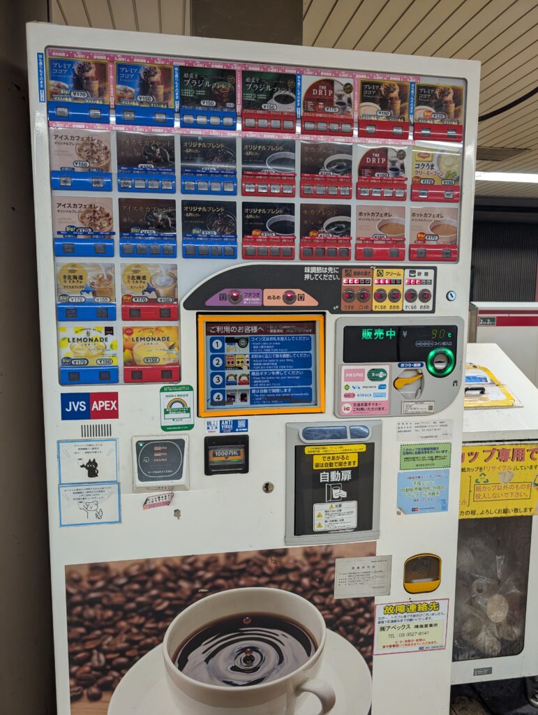 Coffee filled vending machine on the train platform. There are highly specific options for water, cream & sugar!