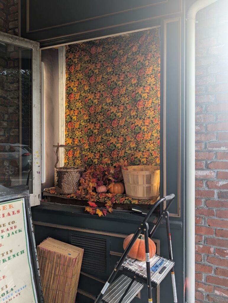 This image of my grocery store’s window in progress brings all the feels. I love my job and I love autumn. I was so impressed with my co worker friend who fixed up the window displays but this progress photo is the stage I preferred.